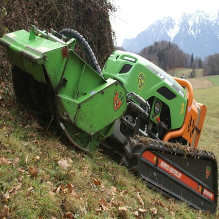 · Broyage avec un p****orte-outil radicommandé équipé d'une épareuse et broyeur forestier.